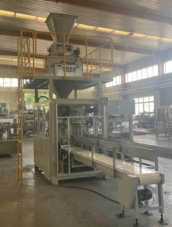 L'ensemble de la ligne comprenant un ensemble ZL25K-A modèle Machine à emballer entièrement automatique, un ensemble ZL25K-S Machine de pesage à servomoteur à double godet (y compris une plate-forme et une échelle et un convoyeur de sortie de produit fini).