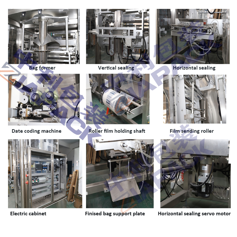 Cette machine d'emballage adopte un servomoteur d'importation pour l'alimentation du film et l'interface homme-machine utilise un écran tactile avancé. Opération plus simple et plus pratique. Tous les composants adoptent une marque de renommée internationale, le PLC est SIEMENS, le servomoteur est PANASONIC, l'écran tactile est SIEMENS, le cylindre et la vanne d'air sont SMC. les pièces en contact avec le matériau, l'armoire de commande, le cadre principal sont en acier inoxydable304