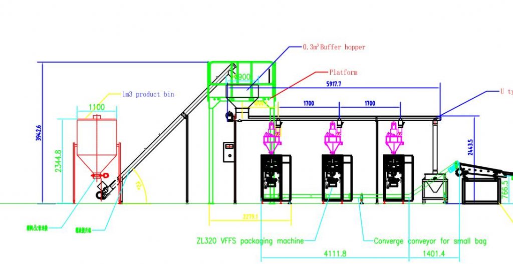 1, petit sac formant la machine d'emballage de remplissage. Cette partie comprend la trémie de matières premières, la machine d'alimentation à vis inclinée. La trémie de tampon intermédiaire et la vis d'alimentation horizontale pour envoyer toutes les matières premières à 6 ensembles
