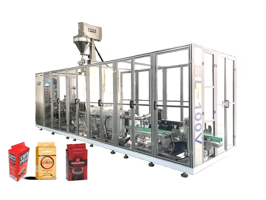 Machine d'emballage VFFS formant le sac par film à rouleaux -Machine de pesage pesant et remplissant le produit .- Remplissage du sac avec chute du produit dans le module de transport du sac -Formation et nettoyage du dessus du sac -Pliage à soufflet du sac --Pré-scellage et vibration du sac chambre à vide ---Mise sous vide et scellage final --Sortie du sac fini et découpe du dessus du sac ---Sortie du sac fini