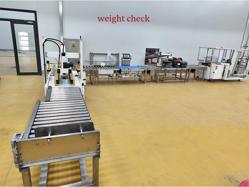 Après avoir rempli les sacs avec des aliments surgelés, chaque sac est revérifié par un détecteur de poids pour s'assurer que le poids correspond au poids cible, puis passe par un détecteur de métal pour s'assurer qu'aucun métal n'est mélangé dans chaque sac. Les sacs sont ensuite transportés vers la ligne de remplissage des cartons.