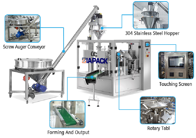 Equipé de remplisseur Augur et d'élévateur à vis, il est largement appliqué à la poudre d'emballage, telle que la poudre détergente, la poudre de lait, la farine, les épices, la poudre de coco, le café moulu, etc.